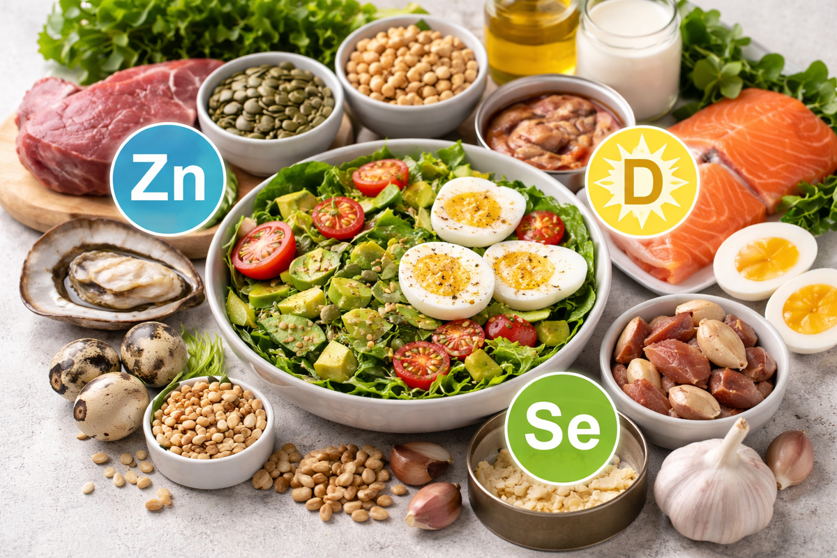 Осенью и зимой нас атакуют советами: «пейте лимон с имбирем», «ешьте чеснок ложками», «купите волшебные БАДы». А по факту — иммунитет не нуждается в магии. Ему нужны конкретные «кирпичики», из которых он строит защиту. Есть три микроэлемента, которые работают как тихие, но незаменимые стражи. Если их не хватает — вы будете цеплять каждую простуду, даже если заливаетесь чаем с малиной. И главная проблема: дефицит этих ребят сложно заметить сразу. Но мы поможем. Давайте разберем, что реально нужно вашему иммунитету, и где это брать, чтобы не разориться на аптеках. 1. Цинк — дирижёр иммунного оркестра Этот парень реально рулит процессом. Без цинка ваши иммунные клетки просто не будут размножаться. Антитела не будут вырабатываться. Организм окажется без армии. За что отвечает: синтез новых иммунных клеток, регуляция воспаления, заживление ран. Симптомы дефицита: вечные простуды, раны заживают как у черепахи, волосы лезут, вкус и обоняние притупились (да, цинк и на это влияет) . Где брать (
