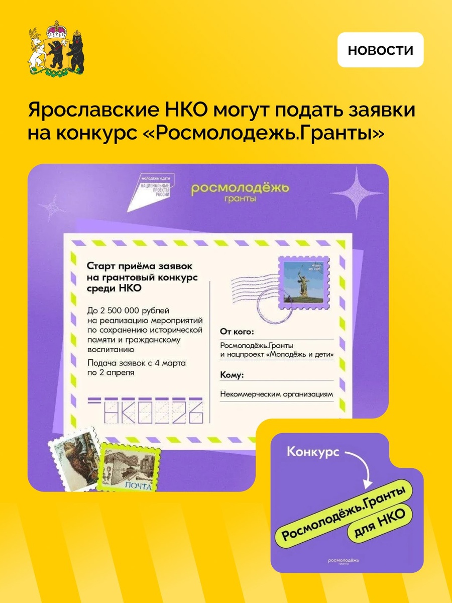 Открыт прием заявок на конкурс «Росмолодежь.Гранты» для некоммерческих организаций. Поддержку получат проекты в сфере патриотического воспитания и просветительской деятельности. Общий грантовый фонд составляет 70 млн рублей, максимальная сумма на один проект — до 2,5 млн рублей. Конкурс включает несколько номинаций, в том числе по сохранению исторической памяти, развитию гражданской идентичности и созданию интернет-контента. Подать заявку можно до 2 апреля на официальной платформе конкурса - https://clck.ru/3SfLfK. Участники получат возможность реализовать социально значимые инициативы и привлечь финансирование для своих проектов.
