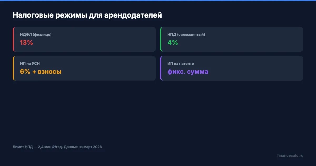 НПД 4% — для самозанятых. Регистрируетесь в приложении «Мой налог», выбиваете чек арендатору — и платите 4% с каждого платежа. Если сдаёте юрлицу — 6%. Лимит дохода — 2,4 млн рублей в год. Режим действует до 31 декабря 2028 года (ФЗ-422).