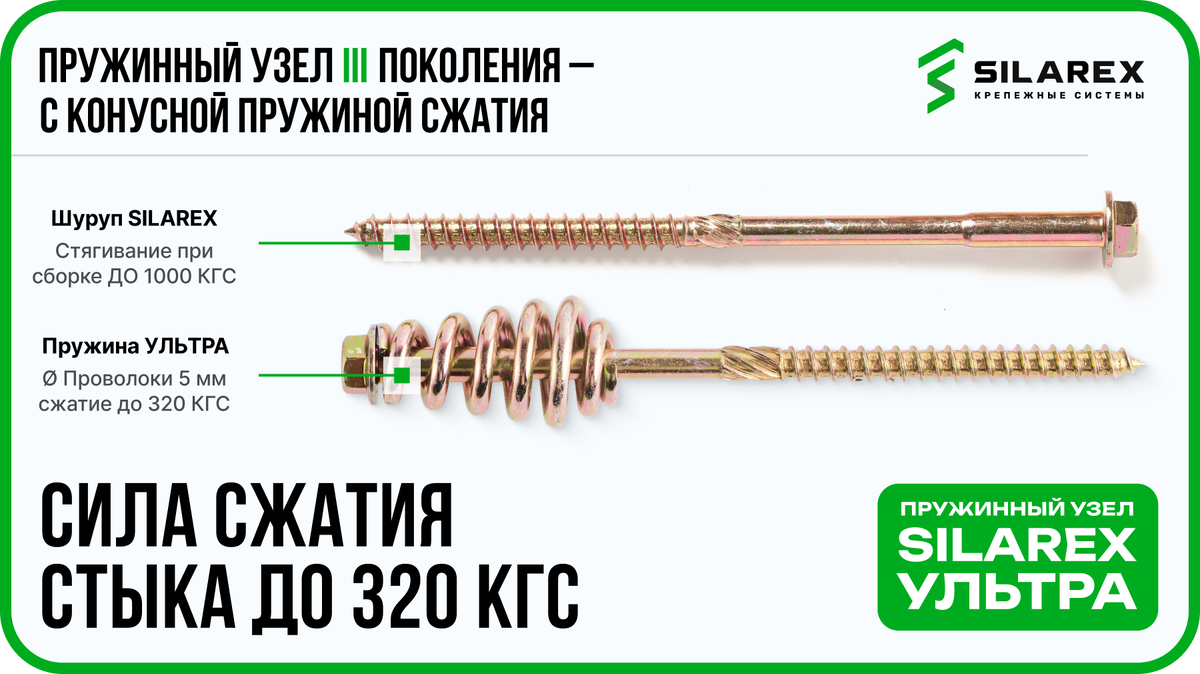 Пружинный узел – это вид специализированного крепежа для скрепления брусчатых или бревенчатых деталей между собой, устраняющий появление зазоров стыков в течение времени, формирование которых является естественным и неотъемлемым процессом коробления деревянных деталей, вследствие естественных для древесины процессов усушки и набухания, что собственно и приводит к вышеупомянутым недостаткам или особенностям деревянных зданий. Пружинный узел конструктивно состоит из шурупа и пружины сжатия, шуруп которого является винтовой тягой, стягивающий детали между собой и устраняя зазоры стыков уже на этапе сборки комплекта стен, а пружина сжатия не позволяет образовываться зазорам стыков в течение времени, сжимает стыки между венцами на протяжении десятилетий без необходимости обслуживания креплений и необходимости нести дополнительные траты по устранению щелей стыков и утепления здания. Пружинный узел «SILAREX» модификации «УЛЬТРА» является 3-м технологическим поколением крепежа и новинкой 2020