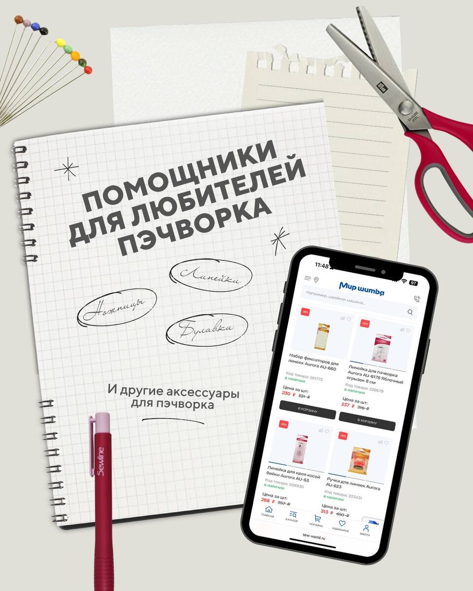 Линейки, ножницы, булавки и другие аксессуары для пэчворка вы можете приобрести по приятным ценам до 22 марта включительно!
