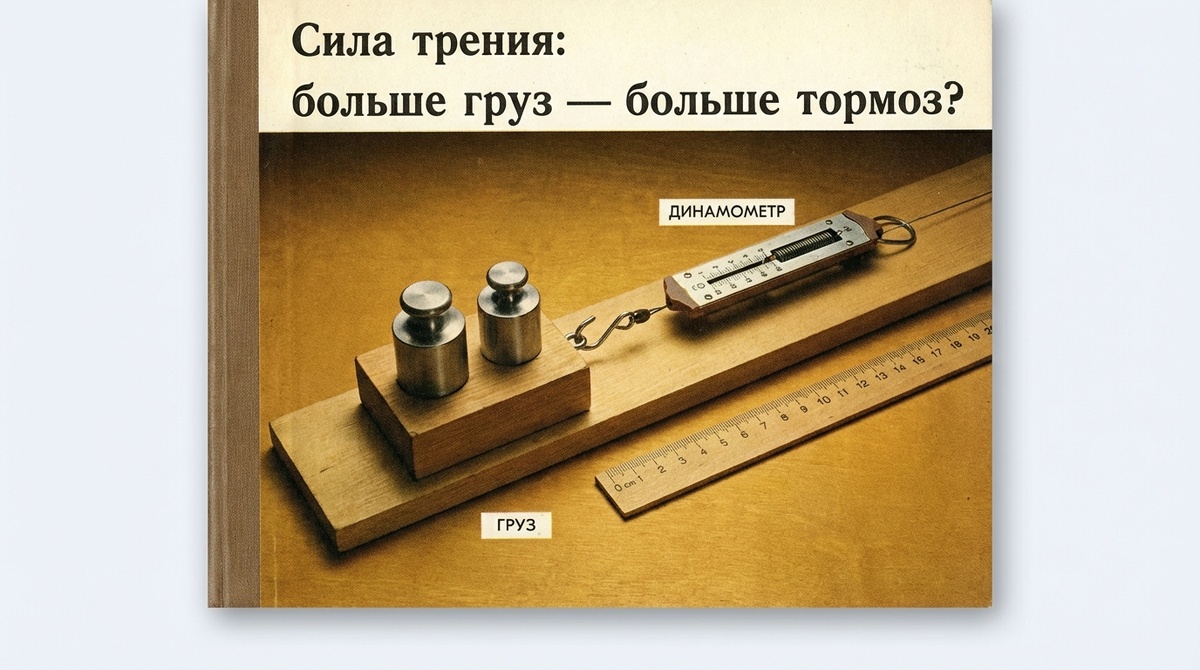 Честно — я первый раз делал эту работу в 7 классе и понятия не имел, зачем тянуть деревяшку с грузиками по линейке. Ну тянешь и тянешь. Учитель смотрит. Что-то там показывает динамометр. Потом до меня дошло. И это реально интересно — если вникнуть. Цель лабораторной работы «изучение зависимости силы трения» — доказать на практике, что сила трения скольжения прямо пропорциональна силе нормального давления. Грубо говоря: больше груз придавливает тело — больше сила трения. Формула простая: F = μN, где μ — коэффициент трения. Из оборудования: брусок деревянный, динамометр, набор грузиков по 100 г и дощечка. Больше ничего хитрого. Тянуть надо равномерно. Это ключевое. Если дёрнул — показания врут. При равномерном движении сила тяги от динамометра равна силе трения — это второй закон Ньютона в действии. Руки должны двигаться как конвейер, без рывков. Мой одногруппник Лёха три раза перемерял, потому что рука дёргалась. В итоге у него коэффициент трения вышел 0,9 — это почти как резина об ас