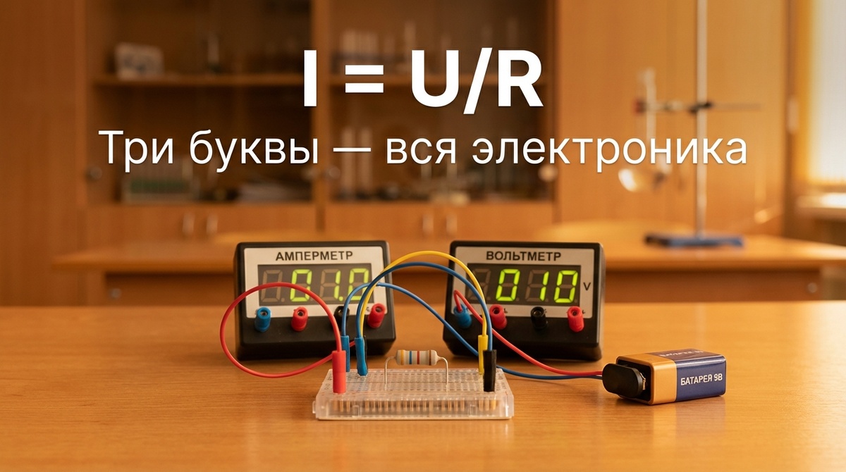 Есть такой тип знаний — выучил, сдал, забыл. Закон Ома — не такой. Он живёт в каждой розетке, в каждом зарядном устройстве, в каждом светодиоде. Ты пользуешься им каждый день, даже если не знаешь формулы наизусть. А в 8 классе его ещё и проверяют экспериментально. Это хорошо. Лабораторная работа «Изучение закона Ома» проверяет: сила тока в участке цепи прямо пропорциональна напряжению на нём и обратно пропорциональна сопротивлению. I = U/R. Оборудование: источник тока (батарейка или блок питания), резистор с известным сопротивлением, амперметр, вольтметр, ключ, соединительные провода. Реостат — если нужно менять напряжение плавно. Амперметр включается последовательно — он сам имеет очень маленькое сопротивление и «не мешает» цепи. Вольтметр — параллельно резистору, потому что измеряет напряжение между двумя точками. Я облажался на своей первой лабе именно здесь: воткнул вольтметр последовательно. Ток через него не шёл почти никакой — внутреннее сопротивление вольтметра огромное. На а