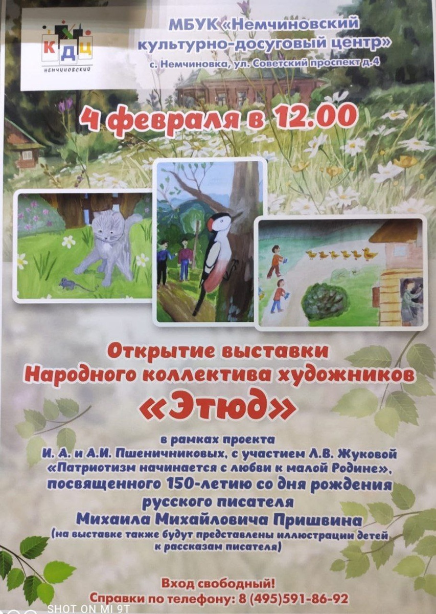 Сегодня 4 февраля в 12.00 в МБУК "Немчиновский культурно-досуговый центр" состоялось открытие выставки Народного коллектива художников "Этюд", посвящённой 150-летию со Дня рождения писателя Михаила Михайловича Пришвина (в рамках проекта И.А. и А.И. Пшеничниковых с участием Л.В.Жуковой "Патриотизм начинается с любви к малой Родине"). На