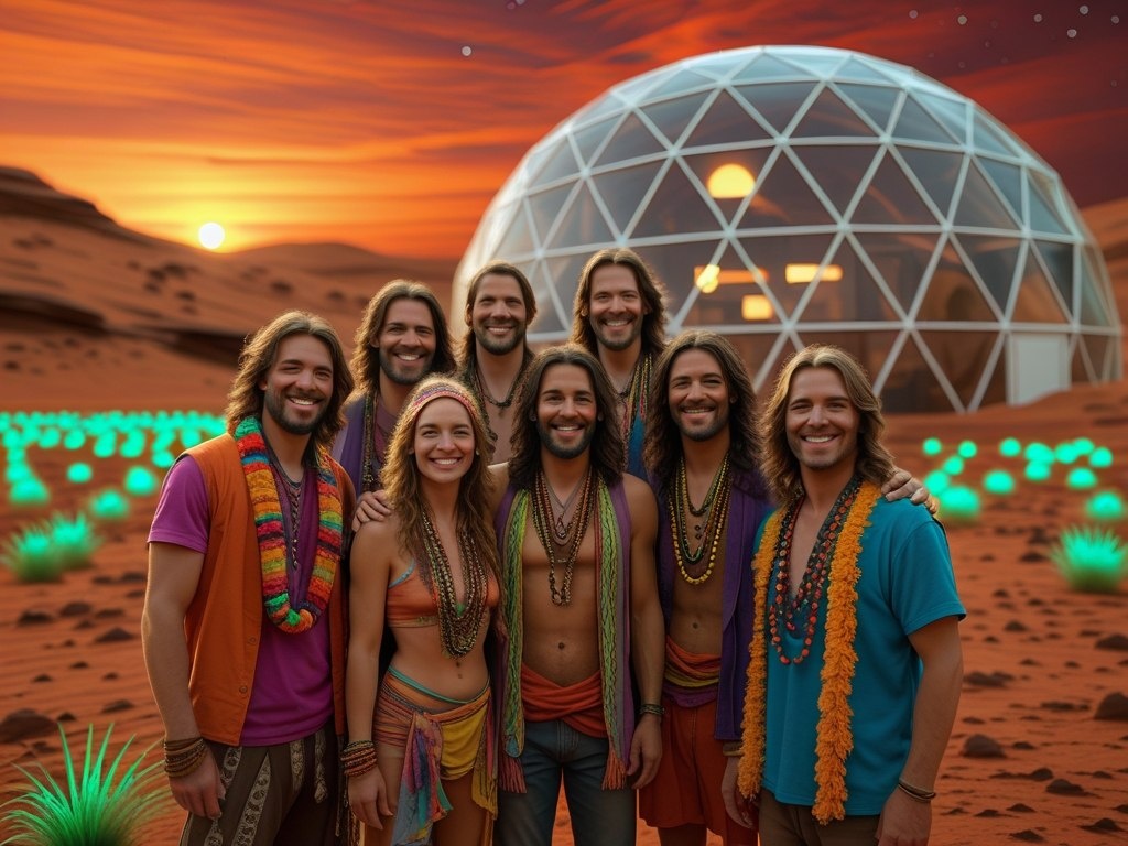 Представьте: не Луна, а Марс стал первой целью человечества. Но вместо холодных расчетов НАСА, на "Арес-1" взлетели самые отвязные хиппи 60-х. Мечты о коммунах, свободной любви и психоделических садах нашли воплощение в суровом марсианском ландшафте. Купола из переработанного пластика, питаемые солнечной энергией, стали новыми "автобусами" для путешествий по сознанию. Марсианская колония "Аквариус" процветала, но не так, как планировали ученые Земли. Эксперименты с генномодифицированными растениями дали неожиданные плоды: светящиеся грибы, танцующие на ветру, и фрукты, меняющие вкус в зависимости от настроения едока. Связь с Землей постепенно угасала, уступая место медитациям под красным небом и поиску гармонии с планетой. Красная пыль стала частью их ДНК, а анархия – единственным законом.