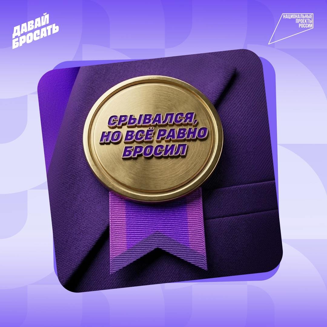 И каждый из них заслуживает почётную награду 🏆 Специально для этого мы решили создать виртуальный мотивирующий значок, который будет напоминать: даже если были срывы и ошибки, у тебя получилось бросить. А это главное! Сохраняй трофей и делись с друзьями, чтобы похвастаться своей победой. В комментариях пиши варианты, какую надпись на медали хотел бы получить ты? 🏅 #вдохновение_без_дыма