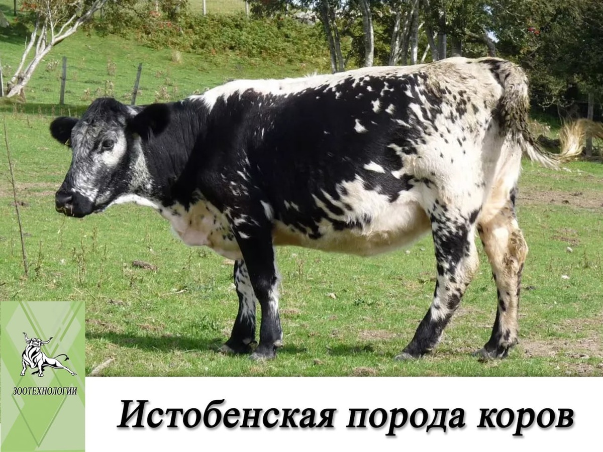 Истобенская порода коров 📖 Село Истобенское в Кировской области славилось наличием отличной кормовой базы, близостью рынков сбыта масломолочной продукции. В конце 19 века в результате скрещивания местного скота с холмогорской, ярославской, остфризской, швицкой и голландской была выведена истобенская порода коров. Сформированная порода получила свое название в честь населенного пункта. В племенную книгу была занесена только в 1943 году. 🐮 Описание породы: Коровы черно-пестрой масти, с белой полосы вдоль хребта. Отличаются невысоким ростом, крепкой и плотной конституцией. Голова грубой формы, лицевая часть удлиненна, тонкая шея с мелкими складками. Глубокая и длинная грудь, узкая холка, удлиненное туловище. Слаборазвитая мускулатура, тонкий костяк, эластичная кожа. Средний промер животных составляет: высота в холке – 129 см, глубина груди – 70 см, ширина груди – 43 см, ширина в маклоках – 51 см, косая длина туловища – 162 см, обхват груди за лопатками –190 см, обхват пясти – 18,5 с