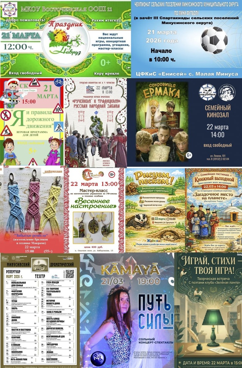 🏛 Погружение в историю и искусство Все выходные в Минусинском краеведческом музее им. Мартьянова (21 марта — с 10.00 до 19.00, 22 марта — с 10.00 до 18.00) работают экспозиции: — историческая экспозиция «Монументальное искусство и Этносы Саяно-Алтая» (I корпус) — историческая экспозиция «Минусинский музей-первый на Енисее» (II корпус) — выставка из фондов научной библиотеки музея «Архитектура моей жизни. М. Я. Вильнер» (I корпус, зал 13) — выставка «Древние украшения из археологической коллекции музея» (I корпус) — выставка «Новые поступления» (I корпус) — международный выставочный проект «Ангелы мира» (II корпус) — выставка «Продолжатели дела Н. М. Мартьянова» (к юбилеям В. Д. Кожанчикова и И. Т. Савенкова) (I корпус) — международный межмузейный выставочный проект «Древнее настенное искусство северных степей Китая. Древняя настенная живопись» (галерея) — художественная выставка к юбилею Я. Д. Марковского «Что я видел ...» (III корпус) В эти дни можно также посетить: — экспозиции от
