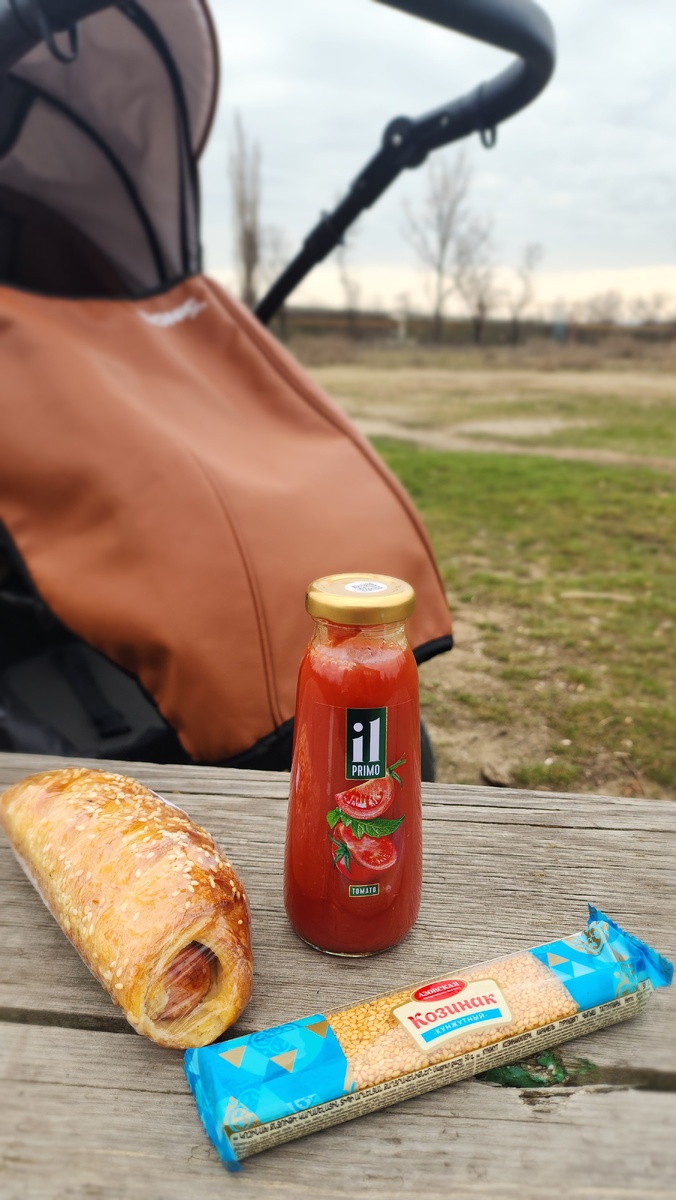 С полки взяла свежайшую сосиску в тесте, ещё тёплую, томатный сок вместо кофе, на десерт - козинак.