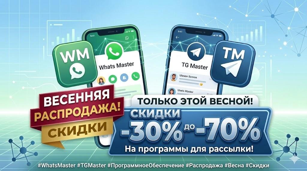 🎁 ВЕСЕННЯЯ РАСПРОДАЖА 🎁 Скидки от -30% до -70% 🎁 На TG Master и Whats Master 🚀 Скидку -30% можете получить на ВСЕ тарифы! По промокоду: SPRINGSALE На сайте програм TG Master и Whats Master Просто укажите промкод SPRINGSALE при оплате! (Цены на сайте указаны без скидок сейчас) Так же делаю Огромную скидку на скрытый тариф VIP безлимит. Который имеет все преимущества VIP тарифа, но без ограничений по времени (Вечный) 💎 -70% (30к Вместо 100к) - VIP Безлимит на TG Master можете забрать по ССЫЛКЕ 💎 -75% (25к Вместо 95к) - VIP Безлимит на Whats Master можно забрать ТУТ P.S. Вы можете так же продлить по этим ценам Ваш текущий тариф. Мы просто приплюсуем его к текущей лицензии. Успевайте! Акция ограничена по времени!