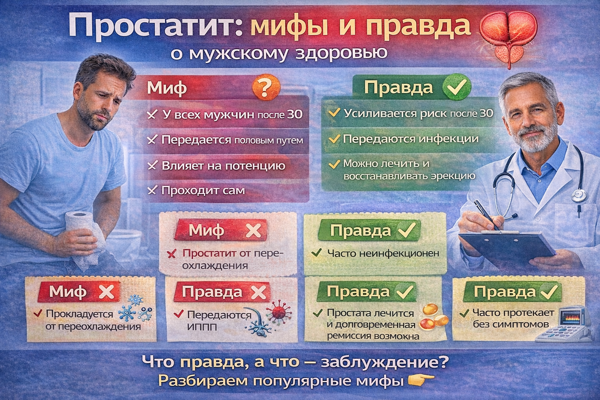 После 30 лет риск действительно растёт, особенно при сидячем образе жизни. Но это не «обязательный этап взросления». Факторы риска: Миф №2: Простатит передается половым путем Правда:
