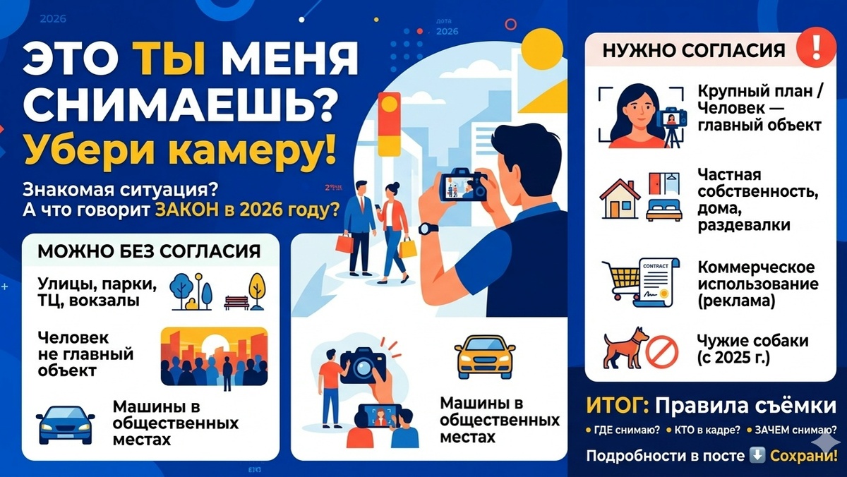 Знакомая ситуация? Идёшь по улице, снимаешь красивый закат или крутой фасад, а в кадр случайно попадает прохожий. И тут начинается: "А почему это вы меня снимаете? У меня паспортные данные! Я в суд подам!" Разбираемся раз и навсегда: можно ли снимать людей, машины, чужих собак на улице и в общественных местах без согласия? КОРОТКИЙ ОТВЕТ: ДА, МОЖНО. Но есть нюансы. Запоминайте три главных правила съёмки в 2026 году. Правило №1. Общественное место = свободная съёмка Согласно статье 152.1 Гражданского кодекса и разъяснениям юристов, снимать людей в общественных местах можно без их согласия, если человек не является основным объектом съёмки . Что считается общественным местом: Улицы, парки, скверы Торговые центры (общие зоны) Кафе, рестораны, стадионы Вокзалы, аэропорты Важно: съёмка в общественном месте — это реализация права на информацию и свободу творчества . Поэтому на требование "уберите камеру" в публичном пространстве можно не реагировать. Но без фанатизма. Правило №2. Когда согла