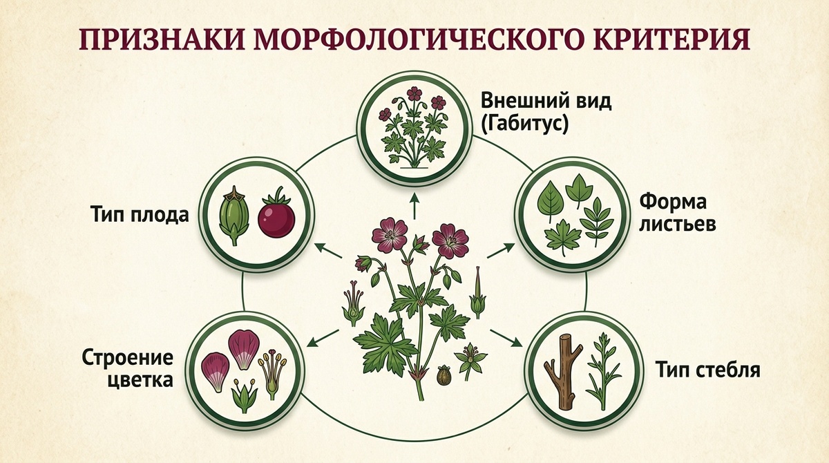 Попробуй объяснить другу, что такое «вид» в биологии. Не по учебнику — просто своими словами. Большинство людей зависает секунд на пять, потом говорит что-то вроде «ну… это когда животные одинаковые». Это не совсем неправильно. Но в науке «одинаковые» нужно как-то измерить. И вот тут появляется морфологический критерий. Морфологический критерий — совокупность признаков внешнего и внутреннего строения, по которым можно отличить один вид от другого. Это первый и самый очевидный критерий. Посмотрел — описал — сравнил. Именно его ты применяешь в лабораторной работе «Изучение морфологического критерия вида». Берут два растения одного рода — например, клевер луговой и клевер ползучий — и составляют их морфологическую характеристику. Звучит просто. На деле требует аккуратности. Вот конкретно по признакам: Клевер луговой (Trifolium pratense): стебель прямостоячий, опушённый. Листочки эллиптические, с беловатым пятном. Соцветие — шаровидная головка, красно-фиолетового цвета. Цветки сидячие. К