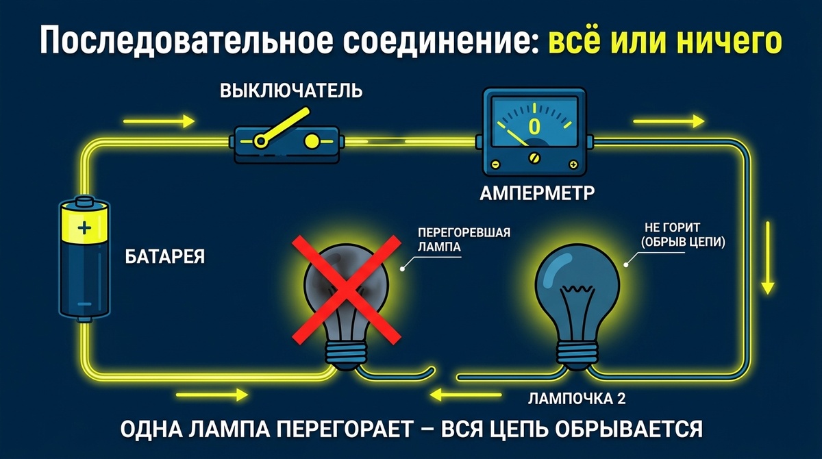 Лабораторная работа «Изучение последовательного соединения проводников»: почему гирлянда гаснет целиком