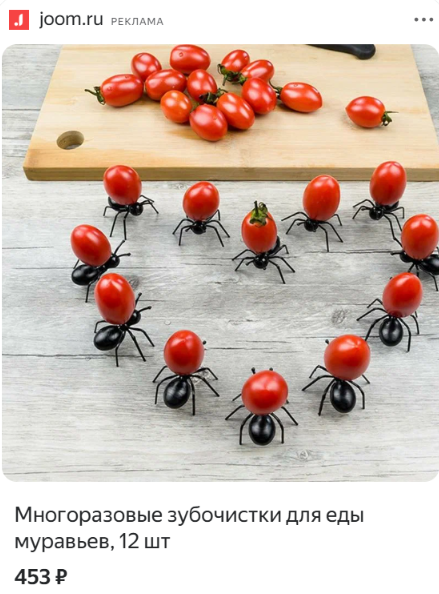 Контекстная реклама периодически подкидывает мне всякие штуки, смысл которых я понять не могу. Вот эти "Многоразовые зубочистки для еды муравьев" - это вообще что? Для кого они? Если для муравьев, то у них нет зубов. Если для тех, кто любит есть муравьев (кстати - кто эти люди?), то почему им нужны специальные зубочистки? И, главное - как этой фигней можно чистить зубы?