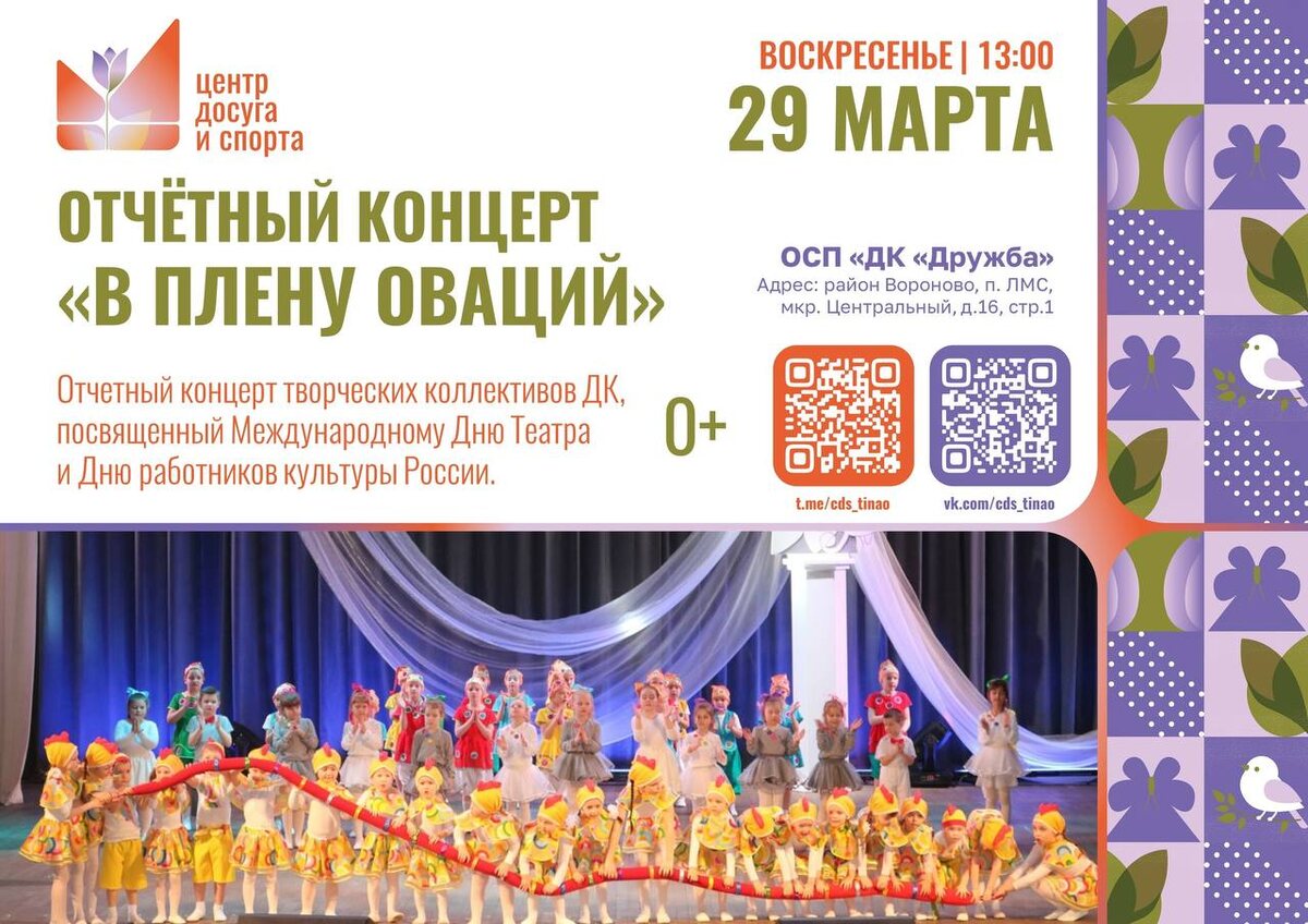 ! ✨ 💫 На сцене соберутся все звёзды нашего ДК, чтобы подарить вам праздник творчества. Вас ждёт калейдоскоп номеров: зажигательные танцы, любимые песни и множество сюрпризов. Обещаем феерию впечатлений и эмоций! Ведь именно ваши овации вдохновляют нас творить дальше 💕 #анонсывороново #анонсытинао