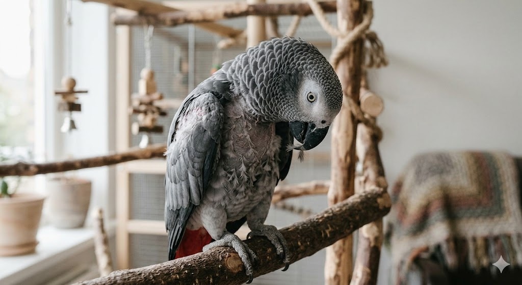 - Займите клюв: Повесьте в клетку свежие ветки дозволенных деревьев (яблоня, береза), фуражные игрушки (где еду надо добывать) и просто погрызушки из безвредного картона.
