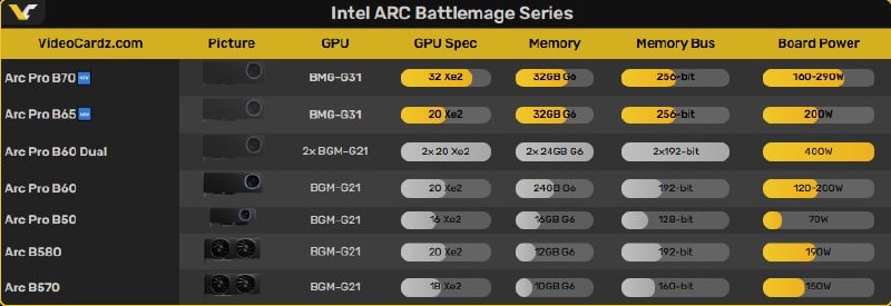 Обе карты получат по 32 ГБ ECC GDDR6. Старшая B70 оснащается 32 ядрами Xe2, младшая B65 — 20 ядрами, что ставит её в один ряд с B60. Энергопотребление у B70 до 290 Вт, тогда как B65 ограничена 200 Вт.