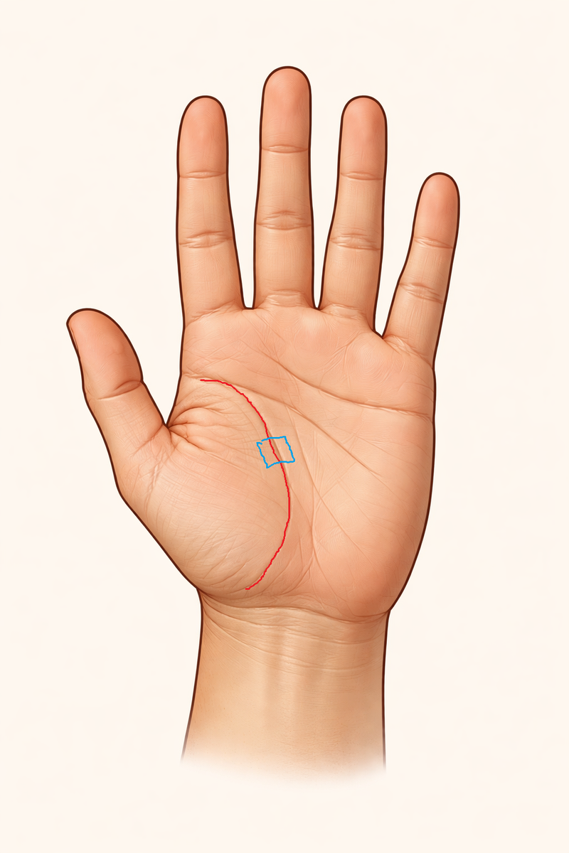 В традиционной хиромантии квадрат считается защитным знаком. Его часто называют «знаком защиты» или «оберегом». Считается, что он смягчает негативные влияния других линий или событий. Значение квадратов в разных местах ладони 1. На линии жизни Считается, что квадрат защищает человека от опасностей. Если линия жизни повреждена (разрывы, острова), квадрат рядом трактуется как спасение или восстановление после кризиса. 2. На линии сердца Интерпретируется как эмоциональная защита. Может означать, что человек способен пережить сильные чувства без разрушительных последствий. 3. На линии головы (ума) Связывается с защитой психики или разума. Иногда трактуется как способность сохранять здравомыслие в стрессовых ситуациях. 4. В центре ладони (равнина Марса) Считается знаком внутренней устойчивости. Может указывать на способность противостоять конфликтам и давлению. 5. На холмах (возвышениях ладони) Разные холмы имеют разные значения: Холм Юпитера (под указательным пальцем)