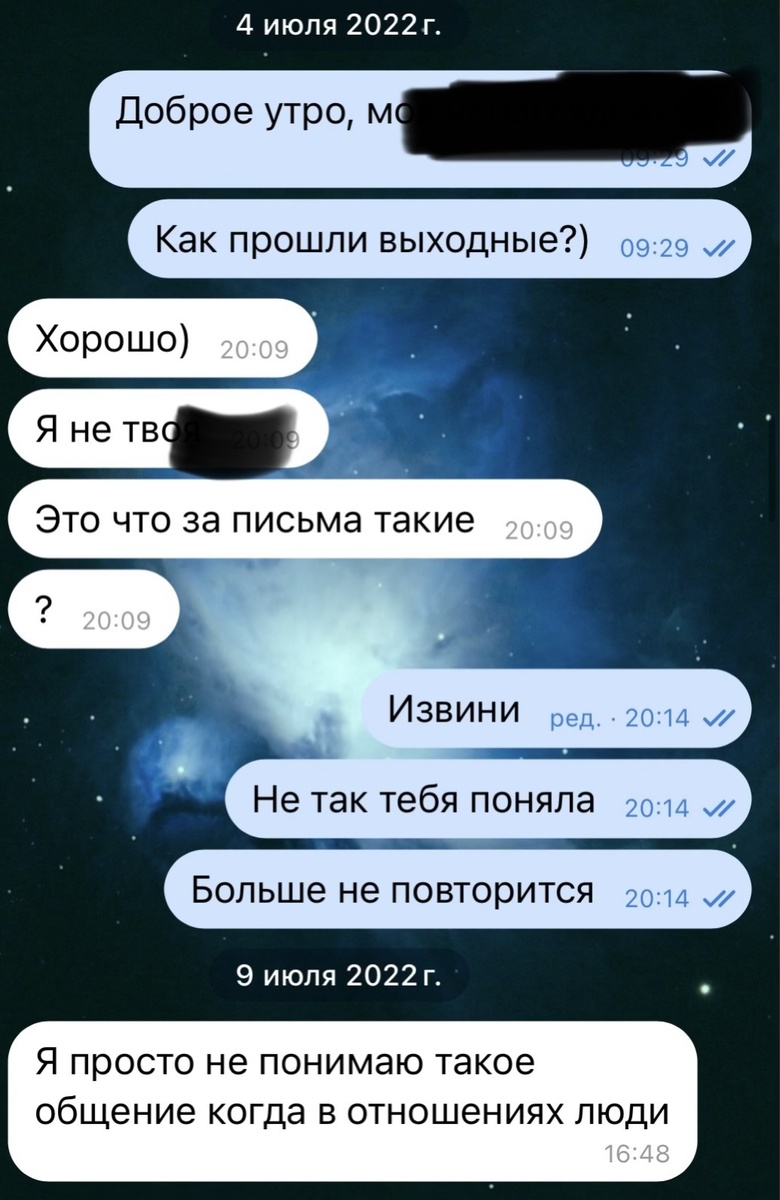 Вы уже обратили внимание, насколько высокомерным было его общение. Меня тошнит, когда я лезу в нашу переписку делать скрины. А вас?