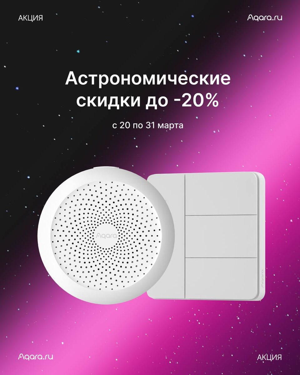 Это не кликбейт! 20 марта — день, когда Солнце пересекает небесный экватор и день ставится практически равным ночи, после чего наступает астрономическая весна! И в честь того, что сегодня «все звёзды сошлись», дарим скидку до -20% на ассортимент Aqara при оформлении на сайте с 20 по 31 марта! Идеи автоматизаций: Комфортный сон для близких Когда все дома ещё спят, а вам нужно собираться — настройте автоматизацию с точечным светильником, осветив только ту зону, которая вам нужна. Когда: время 7:00 Тогда: включить светильник «Гардеробная» на 30% 🔸Накладной точечный светильник T1: 6 490₽ → 5 192₽ 🔸Центр умного дома M1S Gen 2: 6 990₽ → 5 592₽ Всегда в курсе Добавьте отпечаток пальца ребёнка, чтобы всегда знать, во сколько он уходит из дома и когда возвращается! Когда: система опознала члена семьи Тогда: дверь открывается и приходит пуш-уведомление на телефон 🔸Умный замок А100: 34 990₽ → 27 992₽ 🔸Камера хаб G5 Pro: 24 990₽ → 19 992₽ ❕Скидка также распространяется на комплект «За