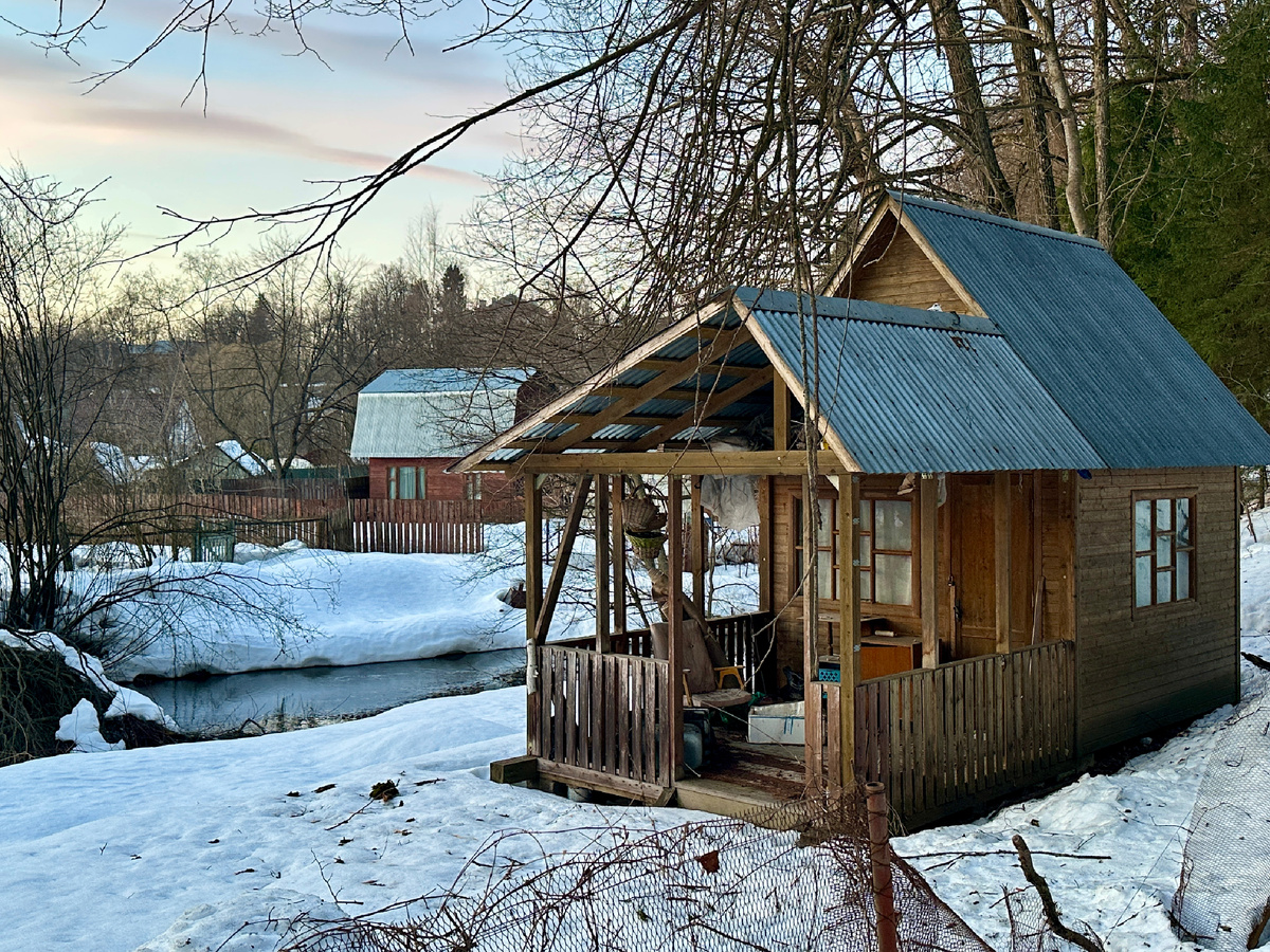 Многие домики выглядят заброшенными. Окна заколочены, крыши местами просели. Но участки при этом не заросли. Земля явно обрабатывается, где-то сквозь снег проявляются аккуратные грядки, дорожки не заросли бурьяном. Кто-то приходит сюда, копается в земле, ухаживает — но делает это в какое-то другое время, когда нас здесь нет.