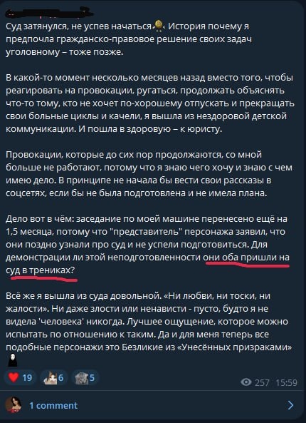 Решение - отказ в иске полностью. 📎Фабула: Истица подала иск к своему бывшему молодому человеку, требуя вернуть автомобиль, утверждая, что он его украл. Однако в материалах дела был небольшой нюанс: ранее она сама призналась что автомобиль обменяла 👀. Когда в суде мы указали на это противоречие - позиция развалилась. 🙈Что было параллельно: Ещё до начала судебных заседаний истица завела Telegram-канал, где начала кампанию по дискредитации своего бывшего партнёра. В постах всё подавалось так, будто дело «выигрышное», а оппоненты - сплошь неадекваты. 🤦♂️Вдобавок досталось и представителю ответчика (мне). ❗️Итог сегодня: суд отказал в иске. ✉️P.S. Скриншоты из канала прилагаю. Интересно, как человек сам себя запутывает: в полиции говорит одно, в иске пишет другое, а в соцсетях рисует третью реальность. ✉️✉️P.S. P.S. По содержанию последнего поста, думаю, можно понять что у человека в голове творится.