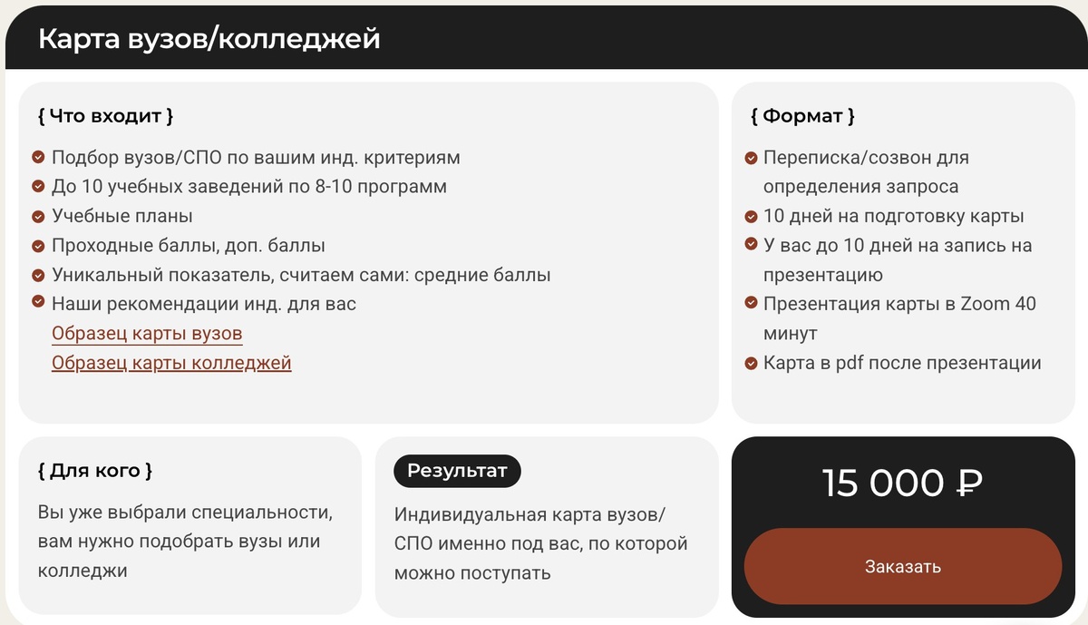 — карта вузов – 18 000 рублей — консультация – 9 000 рублей Особенно советуем обратить внимание на карту вузов: совсем скоро появится официальная информация о количестве платных и целевых мест на направления, и мы сможем составить вам самую актуальную карту. У вас есть время до конца марта, чтобы приобрести услуги по старой стоимости 15 000 рублей – успейте занять свое место в графике и начать подготовку выгодно! Пишите в Телеграм @soprovojdenie_postupleniya Полезная информация о вузах на моем канале в ТГ.