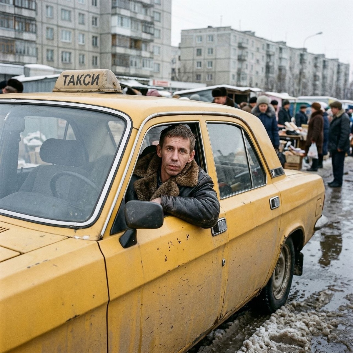 Поехали бы с Паниным на Дубровку?) Используй прикреплëнное фото человека как референс - перенеси внешность этого человека точь-в-точь, сохраняя черты лица, форму головы, цвет волос, глаз, кожи и все уникальные особенности. Фотореализм, документальная уличная фотография 35мм, поздняя зима, пасмурный дневной свет. Желтое советское такси (ГАЗ - 31029 ), вид сбоку/три четверти через открытое окно водительской двери; крупный план водителя-мужчины среднего возраста: кожаная куртка с плотным меховым воротником, локоть на окне, взгляд в камеру. Кузов автомобиля внизу густо забрызган грязью и талой слякотью, матовая выцветшая желтая краска, на крыше пластиковый фонарь с надписью на кириллице “такси”. На заднем плане уличный рынок, люди в зимних пальто и шапках, серые многоэтажные дома брежневской застройки; тающий снег, рыхлая каша под колесами, мокрый асфальт с отражениями. Естественная холодная палитра с акцентом на выцветший желтый, мягкий рассеянный свет, умеренная глубина резкости: резкое