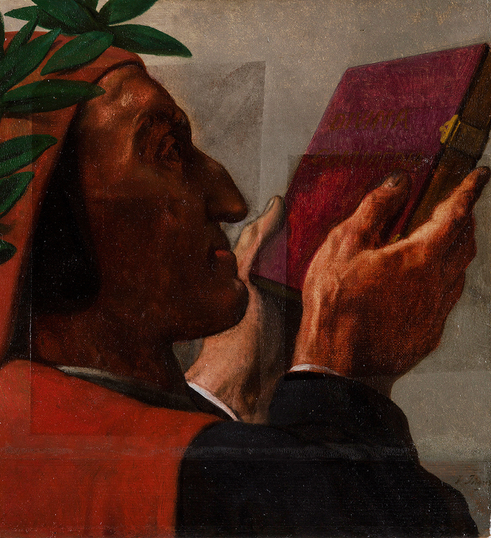 Жан-Огюст-Доминик Энгр (1780–1867) является выдающимся классицистом и рисовальщиком французского искусства. Его часто рассматривают как противоположность Эжен Делакруа (1798–1863), как защитника первенства линии над цветом в живописи. У него было много учеников, и он занимал влиятельное, доминирующее положение в художественной жизни своей эпохи. Картина «Данте, приносящий свои произведения Гомеру» по сути является коллажом. Лицо и рука, вероятно, были вырезаны из эскиза фигуры Данте к монументальной, насыщенной фигурами композиции Энгра «Апофеоз Гомера» 1827 года. Эти фрагменты были позже закреплены на новом холсте, и Энгр завершил фигуру. Техника коллажа сделала позу фигуры сжатой по сравнению с ней же на большой готовой исторической картине, где руки более вытянуты. Интересным моментом является то, что Энгр, похоже, намеренно стремился к такому ракурсу. Он написал фигуру, которая благодаря точному линейному стилю очень чёткая и классическая по выражению, и в то же время странн