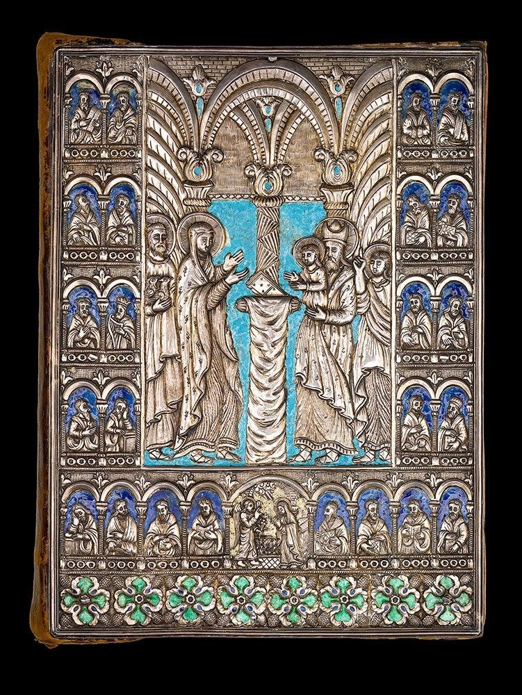 Основой обложки служили массивные дубовые доски, которые затем полностью заковывали в чеканное золото или серебро. Такая книга могла весить 10–15 килограммов.