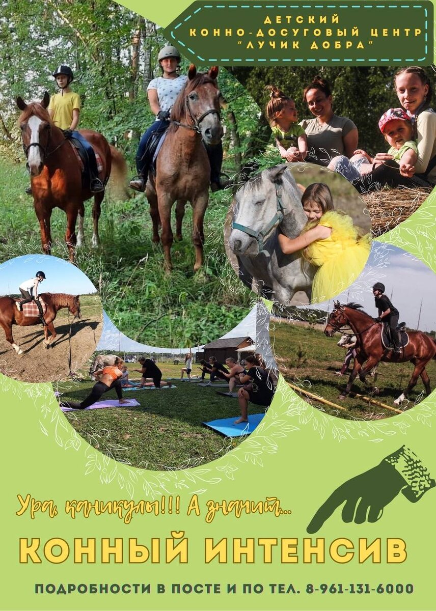 ! 🐎✨ Устали от гаджетов и скучных дней? Приглашаем ваших детей провести весенние каникулы в детском конно-досуговом центре «Лучик Добра» — там, где природа, свобода и благородные животные подарят незабываемые впечатления! 🗓 Даты: с 05 по 10 апреля 2026 года ⏰ Время: 5 дней 5 ночей 👦 Возраст: 7–15 лет (принимаем и новичков, и тех, кто уже знаком с верховой ездой!) Что ждёт вашего ребёнка? ✅ Ежедневные занятия верховой ездой под руководством тренера и инструкторов — учимся держаться в седле, понимать лошадь, осваиваем базовые элементы. ✅ Уход за лошадьми — учимся чистить, кормить, узнавать характер каждого питомца. ✅ Творческие мастер‑классы — рисуем лошадей, создаём поделки. ✅ Активные игры и квесты на свежем воздухе — дружба, командный дух и море смеха! ✅ Фотосессия с лошадьми — снимаем на память. ✅ Уютные посиделки в бане в последнюю ночь с историями и горячим чаем. ✅ Трехразовое питание и вкусняшки включены в стоимость 🌟 Почему это круто? Ребёнок проведёт каникулы активно и