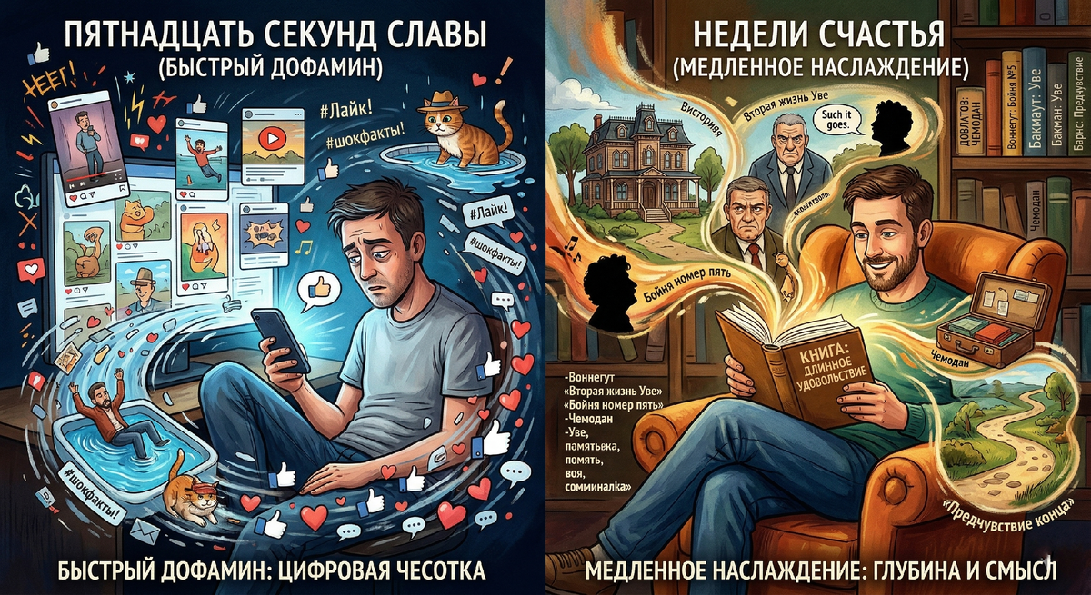 Почему книга лучше пятнадцати секунд славы Знаете, в чем главная трагедия нашего времени? Мы превратились в дегустаторов цифровой пыли. Наш мозг, этот сложнейший механизм, созданный для покорения галактик, теперь дрессирован, как пудель в цирке. Он прыгает через обруч за каждую порцию копеечного дофамина. Пятнадцать секунд видео, где кто-то падает в бассейн, или очередная порция «экспертного мнения» в три строки: и вот мы уже сыты. Но это сытость человека, который пообедал пачкой сахара. Энергии много, а внутри пустота и легкая тошнота. Быстрые углеводы для серого вещества Современный интернет напоминает бесконечный фуршет, где подают только бесплатные закуски. Вы глотаете их не глядя, одну за другой. Алгоритмы знают ваши слабости лучше, чем мама. Они подсовывают вам именно то, что заставит ваш зрачок расшириться на долю секунды. Это и есть тот самый быстрый дофаминовый стимул. Проблема в том, что он испаряется быстрее, чем обещания политика перед выборами.Вы закрываете приложение и че
