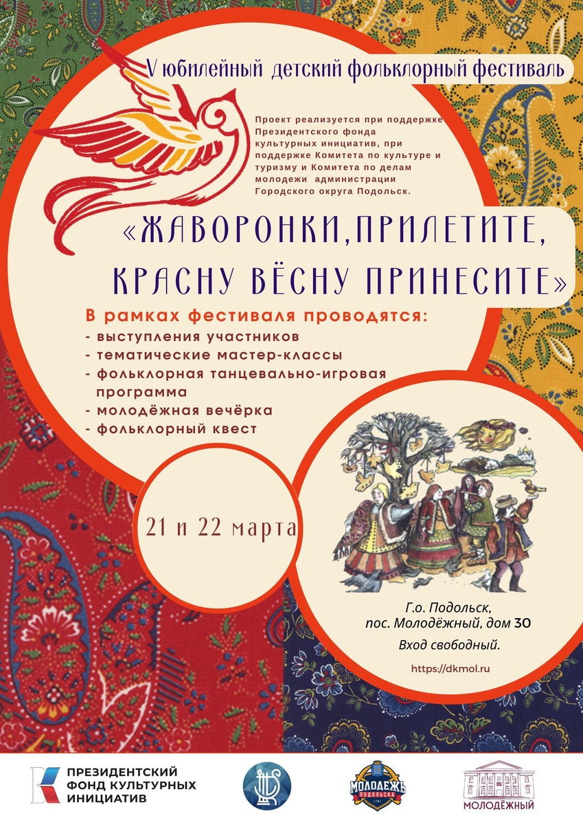 ✨ 21 и 22 марта 2026 года состоится V детский фольклорный фестиваль в пос. Молодёжный В первый день, 21 марта, ждём гостей в доме культуры «Молодёжный». 🛖 А вот второй день фестиваля, 22 марта, пройдёт в Детском лагере отдыха «Родина». ( г. о. Подольск, посёлок санатория «Родина») ❤️ Нас ждут чествования руководителей и концертмейстеров, мастер-классы по росписи, лепке, этнохореографии, вокалу, актёрскому мастерству и игре на традиционных музыкальных инструментах. 📆 21.03.2026 🏢 СДК «Молодежный» 📍 г.о. Подольск, пос. Молодёжный, д.30 💰 Вход свободный❗️ ⭐Поддержать канал голосом 🍰Где поесть в Подольске ✅ Мероприятия Подольск https://dzen.ru/id/66ed500f7b5671493eca3fd6 https://vk.ru/podolsk_events http://dzen.ru/podolsk_events