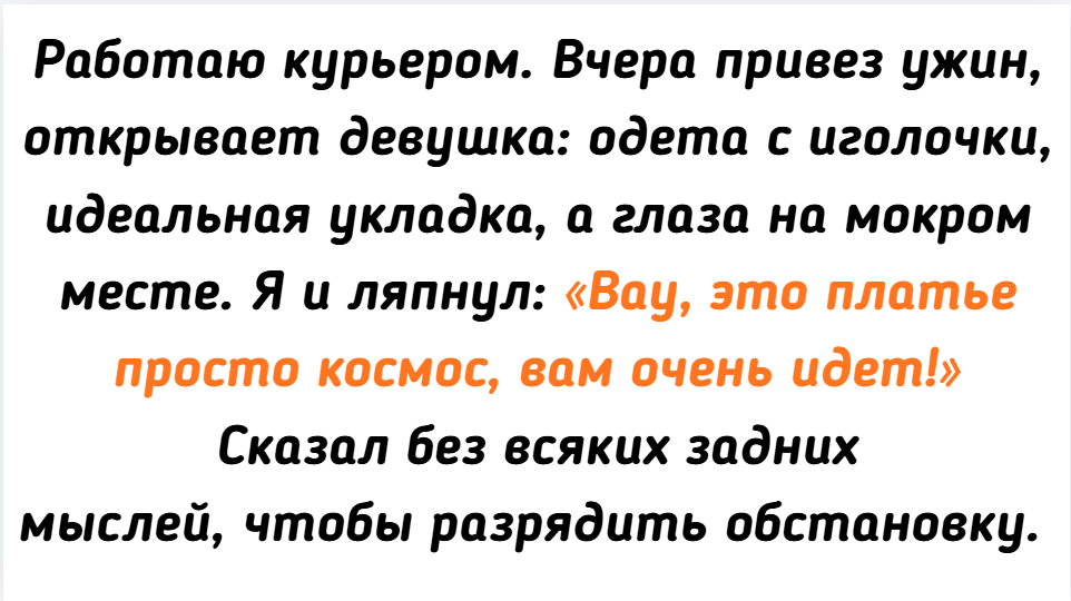 - Работаю курьером. Вчера привез ужин, открывает девушка: одета с иголочки, идеальная укладка, а глаза на мокром месте. Я и ляпнул: «Вау, это платье просто космос, вам очень идет!» Сказал без всяких задних мыслей, чтобы разрядить обстановку. А она замерла и внезапно бахнула мне на чай сумму, превышающую стоимость самого заказа. Я уже успел возомнить себя богом пикапа и ждал приглашения на свидание, но тут она крикнула кому-то в квартире: «Слышал? Даже курьеру не все равно!» Оказалось, она хотела провести романтический вечер с мужем, но он не оценил ее старания.