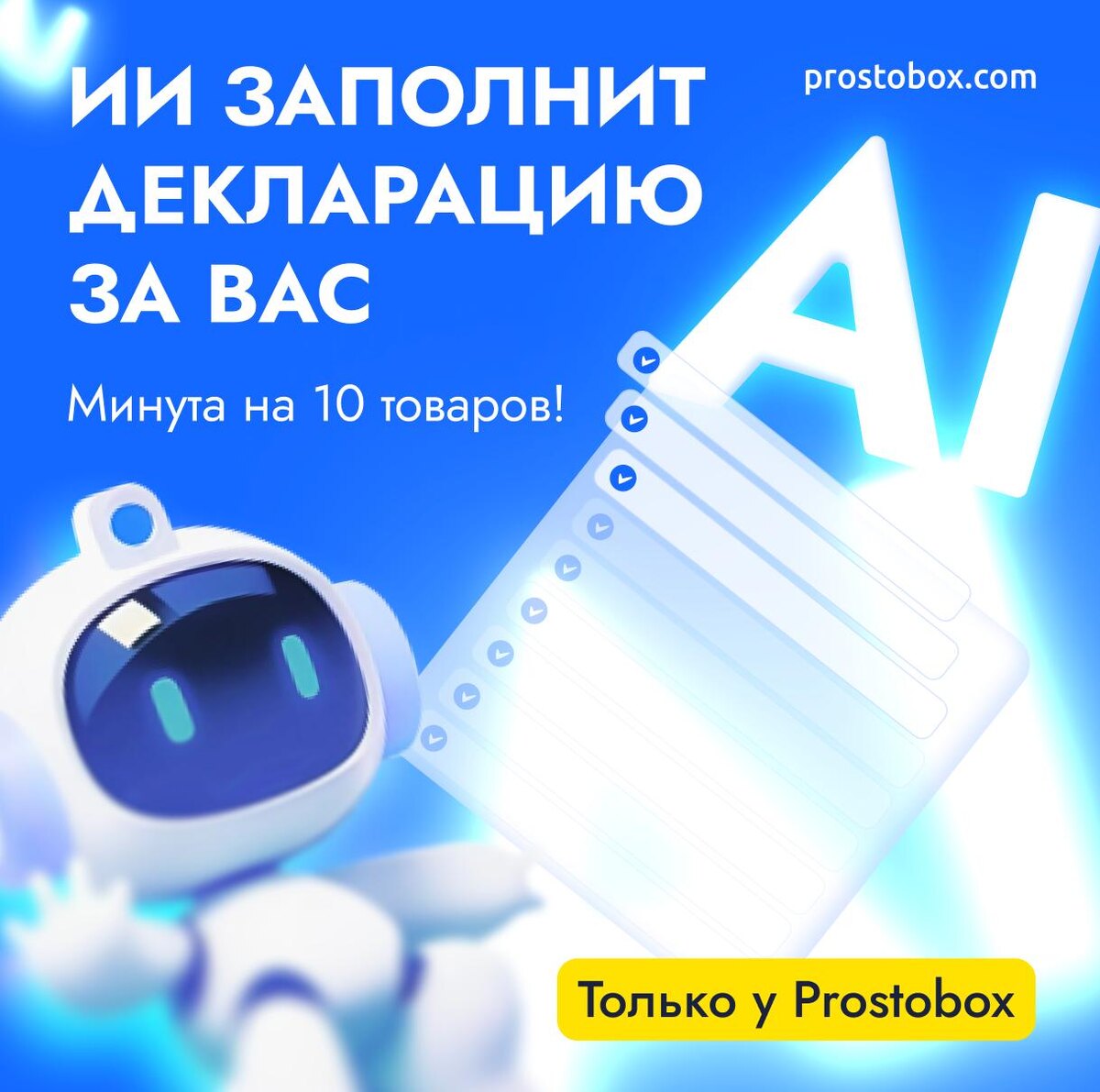 Только в Prostobox! Больше не нужно тратить время на внесение товаров в декларацию вручную - это сделает искусственный интеллект, который сам разберется в ваших заказах и покупках: ✅ Заказывали через байеров? ИИ найдет данные и заполнит декларацию. Вам ничего делать не надо. ✅ Уже начали отмечать, что лежит в посылках? ИИ подхватит эту информацию и все заполнит сам. ✅ ИИ ничего не знает о ваших самостоятельных покупках? Просто сбросьте ему в чат скриншот заказа, ссылку, письмо от магазина или таблицу Excel. Дальше он все сделает сам. 🔥Prostobox - первый и единственный сервис доставки из США, внедривший ИИ для заполнения деклараций. Мы ценим своих клиентов, и хотим сделать вашу работу с нами максимально быстрой и удобной. 🙌Попробуйте прямо сейчас в личном кабинете - просто нажмите кнопку "Заполнить с помощью AI". ⚠️ Функция заполнения декларации работает в тестовом режиме, будем рады вашим отзывам в поддержку.