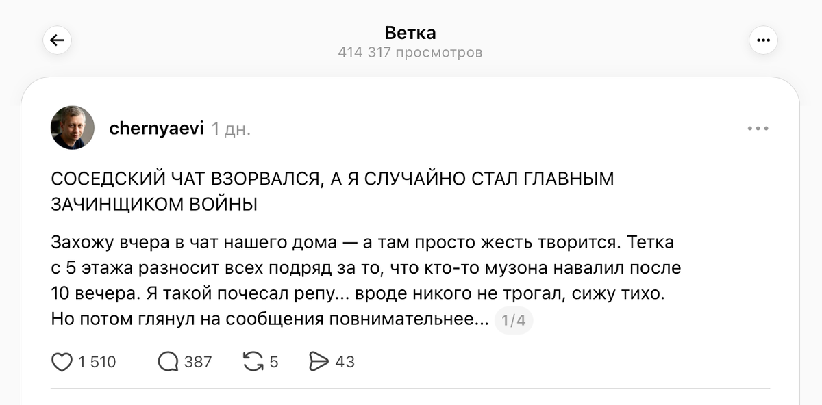 Захожу вчера в чат нашего дома — а там просто жесть творится. Тетка с 5 этажа разносит всех подряд за то, что кто-то музона навалил после 10 вечера. Я такой почесал репу… вроде никого не трогал, сижу тихо. Но потом глянул на сообщения повнимательнее… Вот такая вот байда. Ветка залетела органически, вирусно, собрала кучу реакций. Автор в афиге....))))) ГЛАВНАЯ ЖЕСТЬ: Как алгоритмы убили рекламу Ну так вот. Пока эта соседская санта-барбара набирала просмотры, я решил: а чего добру пропадать? Жахнем рекламу. На контрасте с 400к органики, рекламный пост с прямой ссылкой на Телеграм (t.me/...) собрал позорные 100 просмотров из десятков тысяч охвата всей ветки. Тредс тупо умножил рекламу на ноль. Это слив трафика в унитаз. Верняк. ДИАГНОЗ: Теневой бан за увод аудитории Почему? Алгоритмы Тредс — сцуко хитрые и ненавидят внешние ссылки. Дави спокуху, не надо на них орать, надо понять логику. Тредс хочет держать юзера внутри. Внешний линк — как красная тряпка. Результат: мгновенный теневой бан