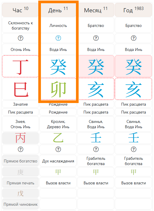 Использован калькулятор Сергея Сычева В обоих случаях есть два общий показателя: -фаза "Рождение" во дворце брака -много воды, которая заливает Земную Ветвь в доме брака. Дом брака в БаЦзы- буквально тот зверёк, над которым сидит дневная доминанта (господин дня), так как он ближе всего к этому человеку. Примечательно, что сила господина дня в основном определяется по сезону, а супруг - просто так "затесался". Что подразумевает: социум важнее чем брак. Официальный штамп может улучшить ситуацию для одного и ухудшить для другого. Сильная карта структуры "Грабитель богатства" Кролик вступает в полукомбинацию со свиньёй в дерево. Мужчине брак полезен: он также даёт ему поддержку от родителей, коллег, друзей. Фаза "Рождение". Но в какой-то момент это слияние может прекратиться приходящим периодом и Кролик буквально начинает гнить в этом браке. То есть если мужчина прекращает сталкивать супругу со своими близкими, то есть изолирует её: включается самонаказание свиней. И жена, и муж буквальн