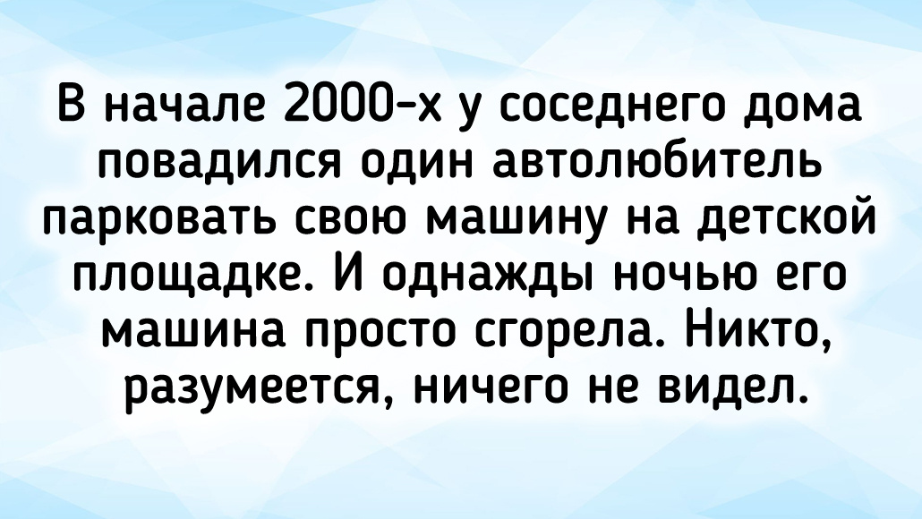 У нас в городе есть район, где стояли деревянные дома с окнами на уровне земли. Вот тоже там повадился один тип не очень умный: молодой мерс ставить и долго заводиться. Естественно, весь выхлоп попадал в окно жильцам. Разговоры, уговоры, даже драки не помогали. Бесполезно. Ну и монтажной пены не пожалели в выхлопную трубу. Участковый ничего доказать не смог. У жильца, на которого сразу подумали, было железное алиби. Он на дачу с семьёй уезжал. А ключи от квартиры отдал родному брату, чтобы тот ночью из окна запенил выхлопную трубу. Всё было шито-крыто. Никто ничего не видел. Все аплодировали стоя!!! © Мышка Норушка / Dzen Один умник парковал своё ведро возле подъезда выхлопной трубой прямо в мусорную камеру. Утром после прогрева дышать нечем было даже на девятом этаже. Один сознательный гражданин не пожалел баллона монтажной пены для фильтрации выхлопных газов. Больше не парковал. © Ваван / Dzen Пшено на капот или, чтобы не так заметно, валерьянка. У нас так один недопонимающий автолю