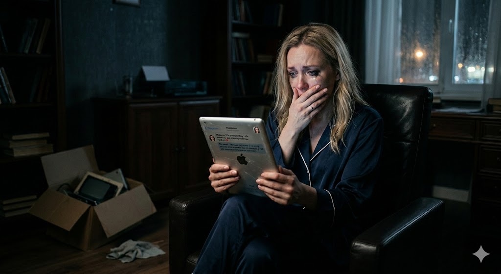 Это был обычный дождливый вторник. Евгений улетел в трехдневную командировку в Питер, и Светлана решила устроить генеральную уборку в кабинете мужа. Она протирала пыль на верхних полках стеллажа, когда случайно задела тяжелую коробку со старой техникой. Коробка накренилась, и на пол с глухим стуком упал старый планшет Евгения.