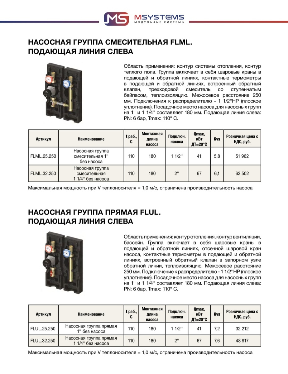 Выбор насосной группы для отопления – это ответственный процесс, который требует профессионального подхода. Правильно подобранное оборудование обеспечит надежность и долговечность системы отопления, а также комфортное тепло в вашем доме или на производстве. При подборе насосных групп для систем отопления важно учитывать специфику системы. Насосные группы могут быть управляемыми (с автоматикой) или неуправляемыми (без автоматики). Оснащены автоматикой. Они позволяют: Регулировать циркуляцию теплоносителя по разным контурам. Автоматика создаёт комфортные условия эксплуатации на постоянной основе. Не оснащены автоматикой. Они применяются в контурах, где не требуется регулировать температуру теплоносителя на подаче. Например: В каталоге MSYSTEMS представлены НАСОСНЫЕ ГРУППЫ СМЕСИТЕЛЬНЫЕ и ПРЯМЫЕ от Ду 25 до Ду 65 Что бы правильно подобрать насосную группу, необходимо просчитать мощность потребителя. Насосная группа 1" выдерживает Qmax -41кВт, насосная группа 1 1/4" Qmax -67кВт.