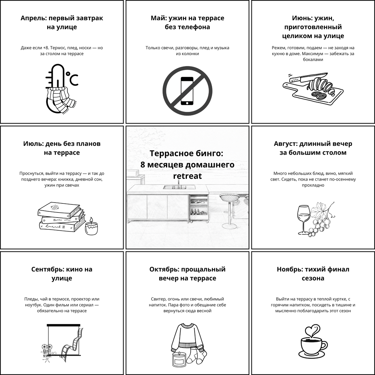 Домашний retreat на террасе — это не про «летнюю мебель», а про маленькие ритуалы, ради которых хочется скорее вернуться домой за город. Давайте пройдемся по сезонам с апреля по ноябрь и соберем своеобразное «террасное бинго», которое захочется закрыть за год. Апрель — время подготовить террасу к сезону и придумать первый теплый сценарий, даже если еще дует ветер.