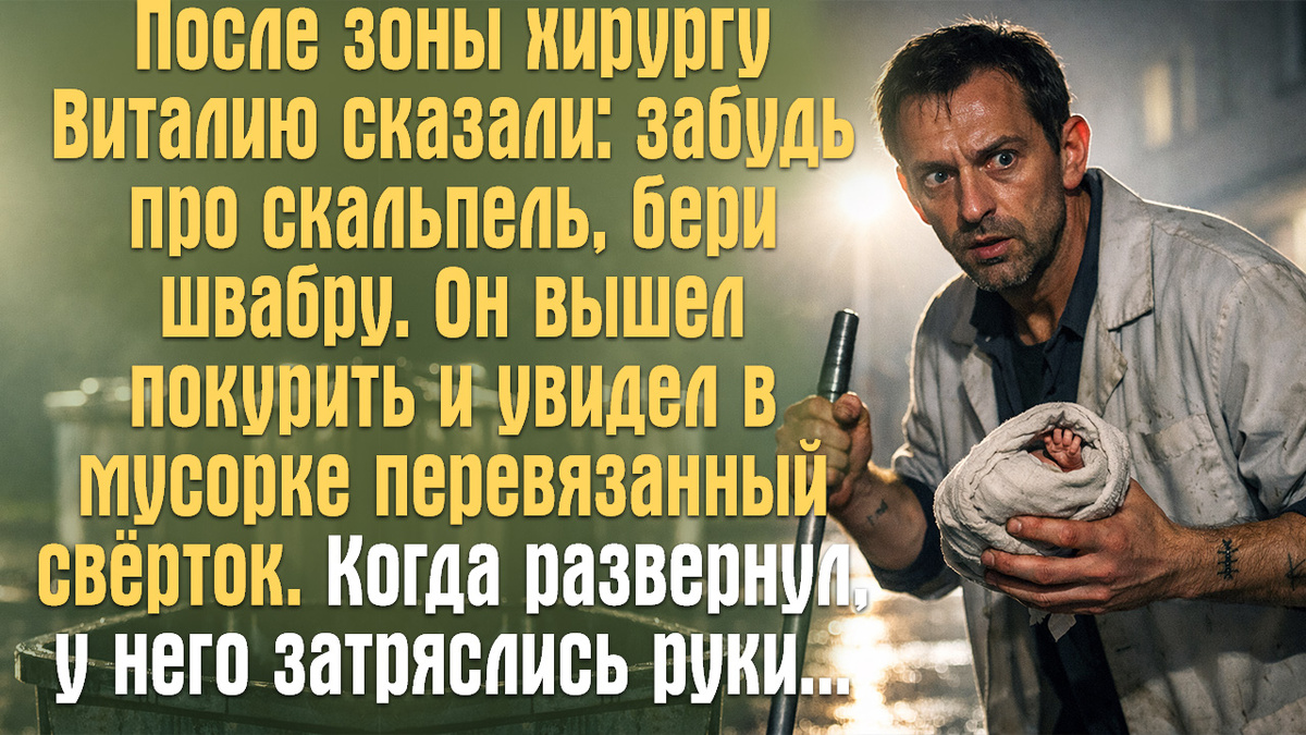 Всё, что было дальше, его тело сделало само. Четыре года без скальпеля, без перчаток, без нормального стола — но руки помнили. Рука помнила, если быть точным, потому что вторая торчала в гипсе и могла только придерживать. Он опустился на колени прямо на асфальт, вытащил свёрток, развернул. Новорождённый. Мальчик. Пуповина кое-как перевязана, кожа с синевой, дыхание едва уловимое. Переохлаждение, возможно аспирация. Виталий прижал ребёнка к себе, здоровой рукой очистил рот, начал дышать ему в лицо — маленькими порциями, осторожно, как когда-то учили на неонатологии, которую он ненавидел на четвёртом курсе и которая вот пригодилась у мусорного бака через двадцать лет.