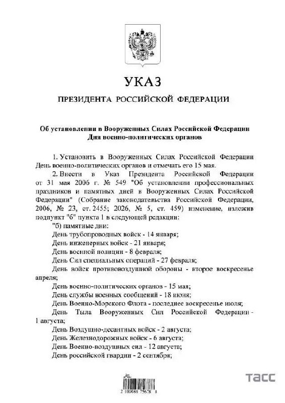 ❗Владимир Путин установил в Вооруженных силах РФ День военно-политических органов — он будет отмечаться 15 мая.