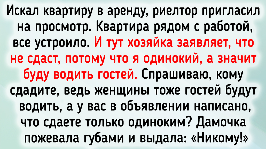 Искал квартиру в аренду, риелтор пригласил на просмотр. Квартира рядом с работой, все устроило. И тут хозяйка заявляет, что не сдаст, потому что я одинокий, а значит буду водить гостей. Спрашиваю, кому сдадите, ведь женщины тоже гостей будут водить, а у вас в объявлении написано, что сдаете только одиноким? Дамочка пожевала губами и выдала: «Никому!»