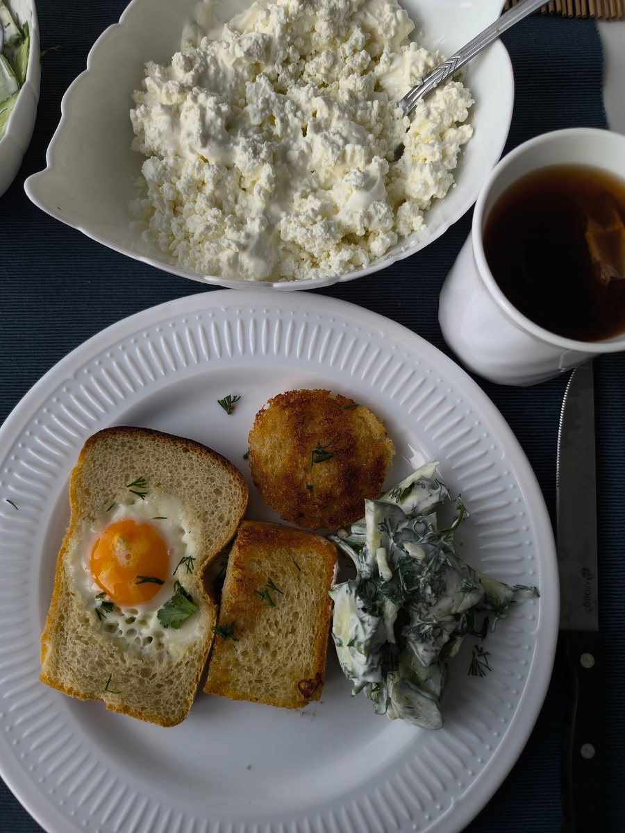 Ночь прошла спокойно в основном. Внешние факторы разбудили лишь разок и то не полностью, просто развернулась на другой бок и снова заснула. Поэтому проснулась хорошо выспавшейся и в хорошем настроении. Восход солнца сегодня не показывали -- в Анапе с утра было пасмурно и прохладно. На завтрак приготовила, как говорится "что Бог послал". А послал он вкусного хлеба, который купила в Новороссийске, и из которого сделала гренки. В одном разрезе хлеба стаканом сделала дырочку, в которую разбила яйцо. Также сделала и вторую порцию. Нарезала салат со свежим огурцом и зеленью, заправила сметаной, сделала творог со сметаной безо всего и чай с ложкой смородиновое варенья из "Чижика". После завтрака день покатился со своими задачами. Утром отправилась на прогулку с посещением всех необходимых мест. Анапа расцветает. Зашла в аптеку, в которой на днях купила абонемент, купить лекарство не из ежедневного списка. Супруг посоветовал перед покупкой сравнивать цены на аптечном маркетплейсе. Сравнила. В