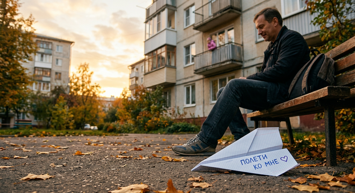 Самолётик летел долго — дольше обычного. Пролетел через весь двор. И опустился — тихо, мягко — прямо у ног мужчины на лавочке.