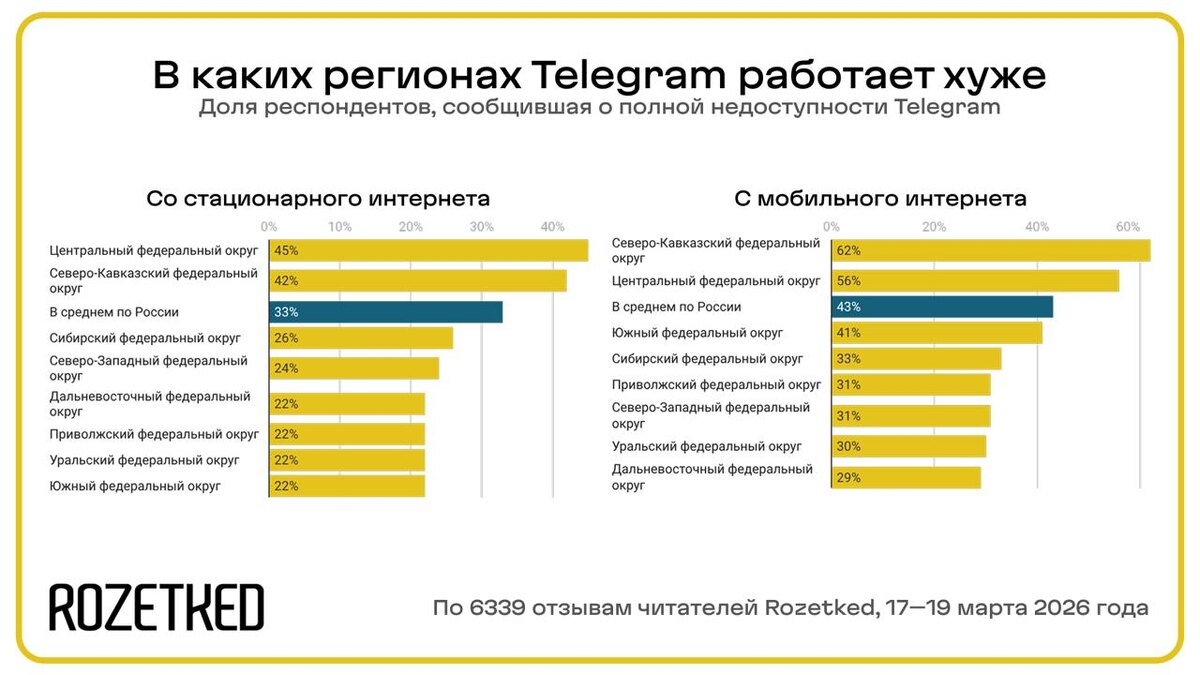Подвели итоги опроса о статусе блокировки Telegram в России 📊 Мессенджер пока не сдаётся: на мобильном интернете Telegram полностью недоступен у 43% опрошенных, при подключении к стационарному интернету — у 33%. Чаще всего о полной блокировке сообщают жители Центрального и Северо-Кавказского федеральных округов. При этом 83% намерены продолжить использование Telegram даже в случае его окончательной блокировки в стране. Больше цифр: rozetked.me/news/45017