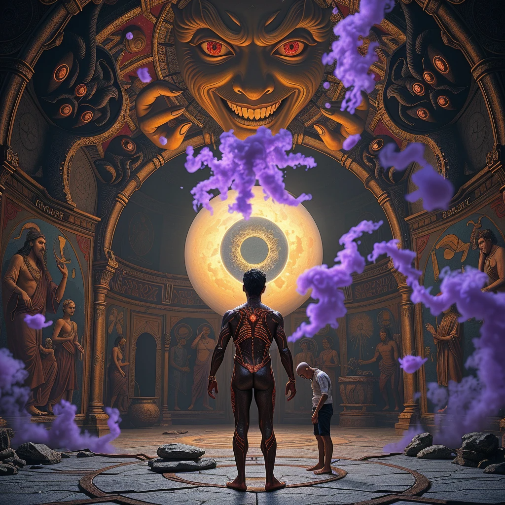 Стены туннеля раскрылись. Перед ним предстал зал — огромный, как собор, но нерукотворный. Потолок терялся во тьме, а пол был покрыт фресками: