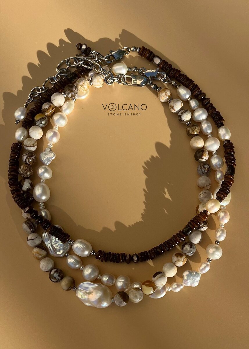 📝Что делает этот приём современным? 🔸Контраст масштабов - массивные натуральные камни рядом с деликатными бусинами дают ощущение продуманной небрежности. 🔸Игра длины - короткие цепи, средние подвесы и удлинённые нити жемчуга складываются в модную «колонну украшений». 🔸Разные текстуры - блеск стали, фактура натуральных камней, мягкое сияние жемчуга создают эффект сложного, дорогого стайлинга. 🔸Вне времени и сезона - натуральные камни, ракушки и жемчуг можно носить круглый год.